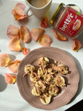 Praženi indijski oreščki*, datlji v prahu*, kokosovo olje brez arome*, eritritol*, karitejevo maslo*, kokosova moka*, rdeča pesa v prahu*, emulgator: sončnični lecitin*, FD jagoda v prahu*, naravna aroma jagode*